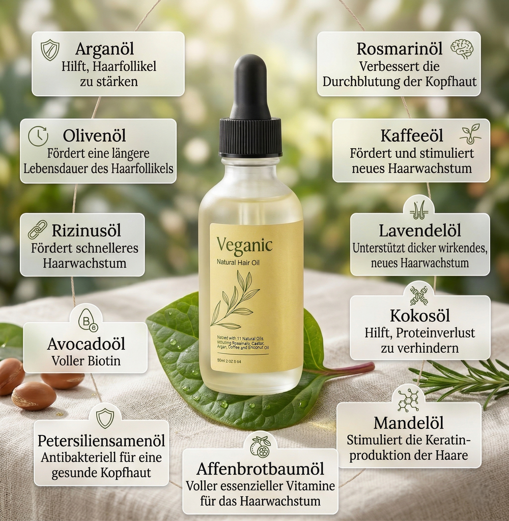 Antwort 2: Das Öl besteht aus einer Synergie von 11 rein natürlichen Pflanzenölen wie Rosmarin, Rizinus, Argan und Kaffeeöl. Es ist 100% vegan, frei von Silikonen sowie Parabenen und wirkt durch Inhaltsstoffe wie Petersiliensamenöl besonders belebend und wohltuend auf die Kopfhaut.